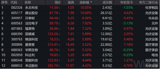 中证800指数成份股方面,光伏、白酒、医美集体走强,光伏权重全线爆发,德业股份涨停;永太科技、德业股份、贝泰妮涨幅居前,法拉电子、福莱特、固德威、锦浪科技、爱美客、华熙生物涨超5%。