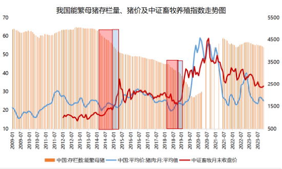 从前两轮(2014年、2018年)猪周期来看,能繁母猪存栏量加速下滑拐点先于二级市场拐点出现,而猪价拐点是最后出现的。比如,2018年下半年,能繁母猪去产能加速后,中证畜牧指数、猪肉价格先后出现大涨。