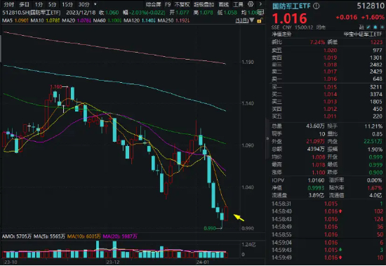 连跌6日后,国防军工板块终于迎来反弹!板块代表性国防军工ETF(512810)午后加速走高,场内价格收涨1.6%!值得一提的是,昨日国防军工ETF(512810)价格刚创下近一年新低。