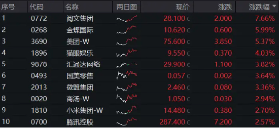 今日(1月11日)港股主要指数全线拉升,大型科网龙头领衔反攻,美团涨超5%,小米集团、腾讯控股涨超2%,快手涨近1%,此外阅文集团、金蝶国际、猫眼娱乐、国美零售等涨幅居前。