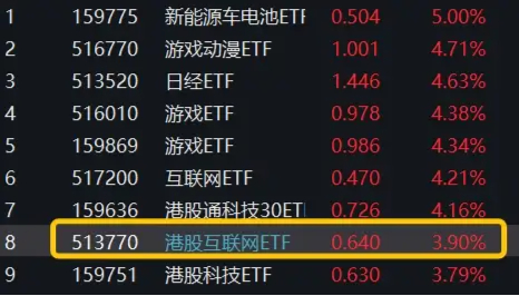 值得注意的是,港股互联网ETF(513770)单日涨跌幅在全市场所有ETF基金涨幅榜中亦处于前列,高居第8位,港股互联网板块的高弹性再度引发关注。