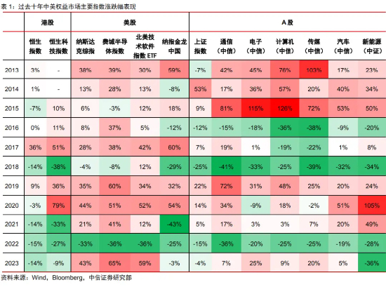 另外,从TMT科技角度来看,中信证券复盘复盘过去十年中美科技股走势、估值和盈利贡献,判断2024年决定美股科技股走势的主要因素可能为:AI能否从估值扩张因素真正转化业绩释放的驱动力,以及美联储缩表进程和降息节奏等宏观因素。
