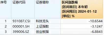 开年以来,受海外不确定因素及内部市场情绪影响,科技板块震荡磨底。截至1月12日,代表A股科技龙头行情的中证科技龙头指数年初以来下跌10.65%,同期上证指数、创业板指数分别下跌3.12%,6.88%,说明科技龙头指数调整较为充分,当前位置配置性价比或较高。