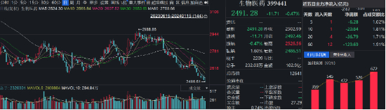 生物医药板块方面,国证生物医药指数小幅收跌0.47%,创近4年来新低!指数成分股涨少跌多,涨幅方面,特宝生物涨3.6%,爱美客涨超1.4%,药明康德涨超1.1%,沃森生物、君实生物、凯莱英微涨。跌幅方面,神州细胞、智飞生物、荣昌生物跌超3%,长春高新跌1.9%,复星医药跌超1.4%,甘李药业、博腾股份、我武生物等跌幅居前。