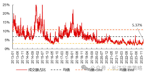 10年维度来看,当前中证红利成交额占比、成交量占比尚处于历史低位,分别为5.37%和7.65%,均处于10年均值水平线下,均值-1倍标准差水平线上。