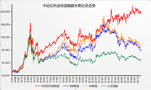 最后看超额的话,进几年的这轮红利行情中,中证红利ETF(515080)绝对一马当先,值得关注。这里就可以看出,单市场的红利ETF和深红利ETF,都在这轮行情中严重落后,落后最多的深红利ETF,比中证红利ETF(515080)差距高达80%+。