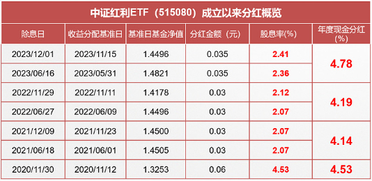 从分红次数看,过去4年,分红次数最多的ETF是中证红利ETF(515080),近三年基本上每年分红两次,基本维持在4.5%左右的分红水平。尽可能选取分红规律、节奏稳定的ETF。