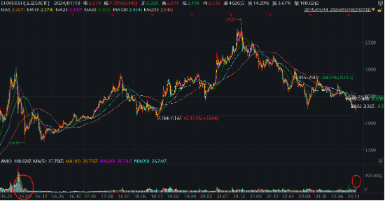 上证50ETF(510050.SH)当日也出现108亿元的天量成交额。根据盘口申购数量测算,沪深300ETF华夏、上证50ETF当日净流入超20亿元、40亿元。沪深300、上证50这个级别的成交金额只在2015年的超级震荡市中才出现过,股民在评论区称之为“神秘力量”。(来源:wind,券商中国)。