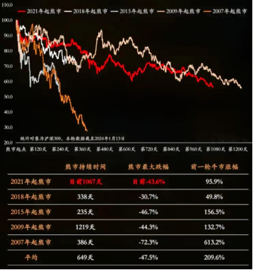 复盘历史上每一轮调整周期,可以看到,因为市场背景不同,调整的深度和长度差异非常大。截至2024年1月18日,沪深300本轮最大跌幅已经超过43%,目前的点位仅比上一轮熊市低点高10%左右,也就是说基本跌回上轮周期的原点了。