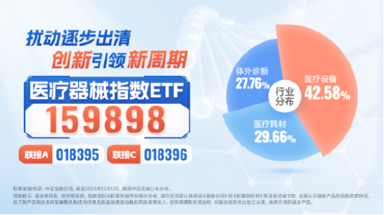 医疗器械指数ETF(159898)被动跟踪中证全指医疗器械指数 (H30217.CSI),一指覆盖医疗设备、医疗耗材、体外诊断、医美等细分领域,表征A股医疗器械板块走势。未来,在医疗刚需、国产替代、器械出海以及政策支持下,国内器械行业有望保持较快增长态势,二级市场也有望迎来修复行情。