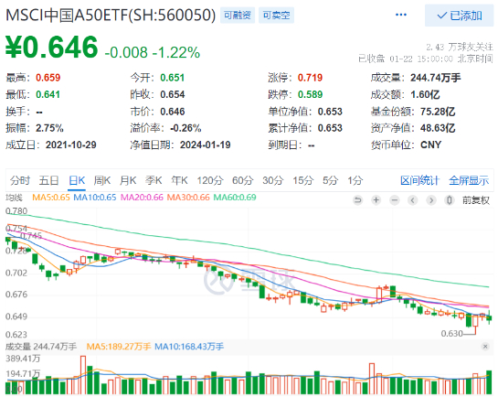 热门ETF方面,MSCI中国A50ETF(560050)冲高回落收跌1.22%,回踩5日和10日均线,全天成交额达1.6亿元,环比激增近47%,大幅放量!