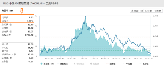 截至2024年1月22日,MSCI中国A50指数最新PE仅9.23倍,处于近五年0.38%的分位,低于近五年来99%以上的时间区间,估值性价比凸显!