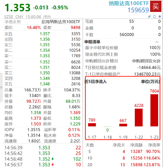 纳斯达克100ETF(159659)昨日强势吸金超7600万元,规模创上市新高,年内份额激增123%位居同类第一!