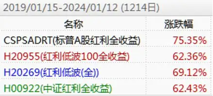 下图是近5年、近3年、近1年几个主要的红利指数的涨幅对比,标普A股红利在这3个区间全部跑赢。(截至2024-1-12)