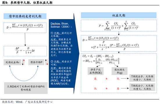 “利率敏感性”在固定收益领域常用“债券久期”来进行分析,衡量的是债券价格对到期收益率R的敏感度。我们将这一概念引申至A股市场,参考Dechow, Sloan, Soliman(2004)5将权益久期分解为有限期与无限期的处理方式,并进一步通过财务报表数据,预测有限期内的股权增长率(g)以及净资产收益率(ROE)。过程中,我们借鉴文献方法,将两者均建模为AR(1)过程。最后得到了A股各类股指的隐含久期。