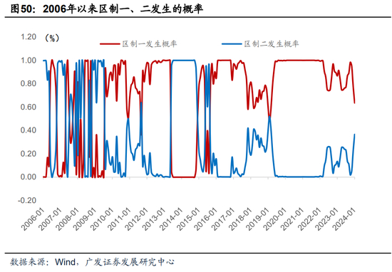 另一种加权思路是通过将择时指标与中证红利指数进行回归,将回归系数作为权重进行信号加权。但由于不同择时指标与中证红利之间的关系存在时变性,我们将数据进行了区制识别(regime switching),发现2006年以来,择时指标与中证红利之间的关系确实存在不同的区制反应。特别是2020年之后,区制一发生的概率稳定在0.6以上,而区制二发生的概率稳定在0.4以下。