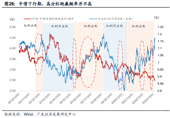从时段统计看,即便是10年国债利率上行期,红利指数仍有可能占优,比如2012-13年、2016-17年以及20-23年的部分时段。
