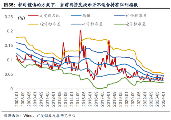 最后从交易层面,我们构造了衡量红利指数拥挤度的指标——红利指数成交额占全A成交额比重,来判断下一阶段红利指数是否仍值得追涨。并且,我们同样使用滚动36个月的±1倍、±2倍标准差作为评价拥挤度是否过高或过低。直接观察成交量占比指标,会发现2020年以来,这一拥挤度指标始终处于偏低水平,但如果以36个月作为窗口期考察,2023年5月以及12月、24年1月,拥挤度的水位均出现了抬升。作为红利资产择时的负向信号,我们选择相对谨慎的方案,如果观察到滚动36个月的拥挤度水位大于均值,即认为当前拥挤度视角并不适合持有红利指数。