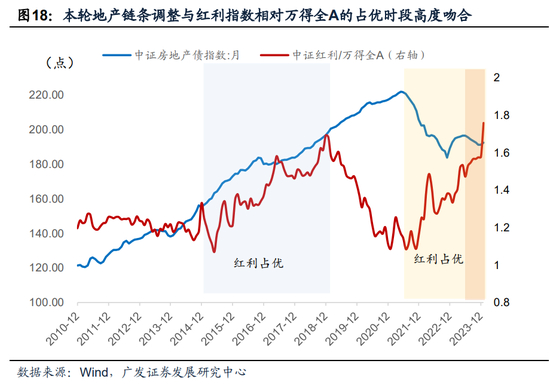 另一个23年红利资产受热捧的重要因素,是21年以来,地产产业链处于持续调整过程,带来了微观主体风险偏好的下降。我们在前期报告《2023年权益行业表现的宏观和中观线索》将中证房地产债指数作为风险偏好的表征指标,发现该指数在23年快速下行,万得全A也同步调整。而若将其与红利资产的相对收益进行比较,同样发现,与过往不同,本轮地产链条调整与红利指数相对万得全A的占优时段高度吻合,凸显了该类资产因其“防御属性”而受追逐。