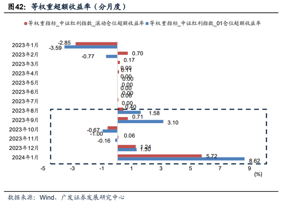 分年度来看,该方案能获得超额收益的年份主要是2016-2018年、21-22年以及24年;分季度来看,22年至今,主要是22年一季度、三季度、23年三四季度以及24年一季度能获得超额收益;分月度来看,超额收益主要集中在23年8、9、12月以及24年1月。