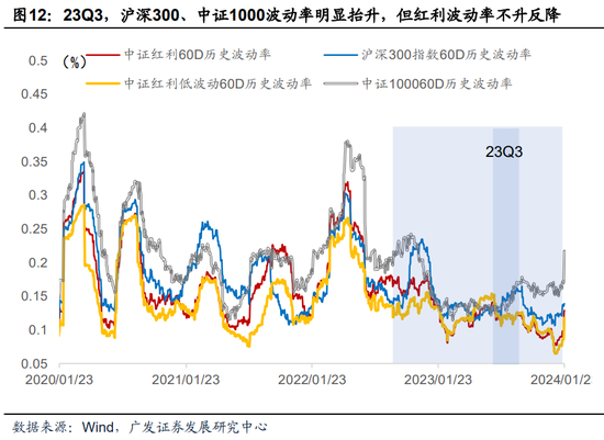 波动率方面,通过对比各类指数滚动60天的历史波动率,可以看到中证红利指数的波动明显低于沪深300、中证1000。特别是2023Q3,在美债利率快速上行的影响下,沪深300、中证1000波动率明显抬升,但中证红利指数、红利低波指数波动不升反降。