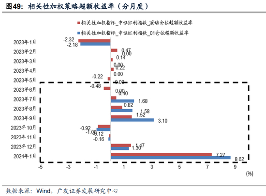 在该择时信号下,2024年1月15日-2月14日的仓位信号使用23年12月的择时信号,为0.38。虽然信号为正,提示继续持有红利指数,但已较10-11月进一步走弱,10月、11月0.95、0.75,提示红利指数2023.10.15-2024.01.14的持有仓位分别为98.6%、84.4%、59.4%。并且当前披露的数据合成的24年1月择时信号为-0.002,提示2024.2.15-2024.3.14应持有万得全A。