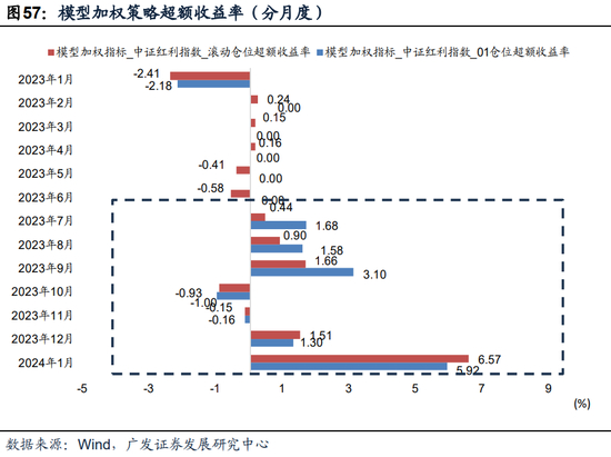 2024年1月15日-2月14日的仓位信号使用23年12月的择时信号,为2.17,信号为正,同样提示继续持有红利指数;23年10-11月的信号分别是3.5、2.94,提示红利指数2023.10.15-2024.01.14的持有仓位分别为100%、89%、74%。