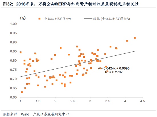 第四,风险偏好的整体下移,会强化对红利资产的稳定收益的需求。2016年以来,万得全A的ERP与红利资产相对收益呈现稳定正相关性。
