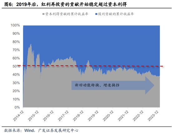 从贡献度来看,自2011年以来,中证红利全收益指数涨幅165.8%,其中分红再投资贡献了103.2%,资本利得贡献了62.6%,前者是后者的1.65倍4。2019年后,红利再投资的贡献开始稳定超过资本利得。
