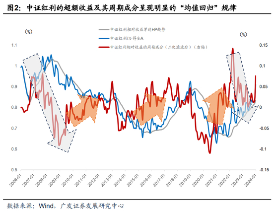 再次,我们还利用单边HP滤波过滤中证红利相对万得全A的超额收益,结果表明,剥离趋势以及短期噪音后的超额收益周期成分呈现明显的“均值回归”规律。