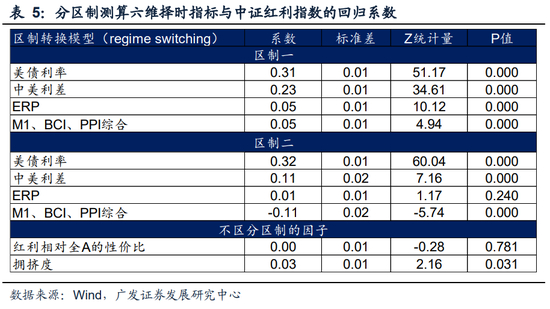 由此,我们构建了区制转换模型(regime switching),发现不同的择时指标在两个区制上的系数分别显著,并且存在较大差异,只有美债利率、ERP指标相对稳定。