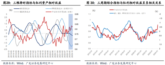 从历史走势来看,三维择时综合指标与红利指数相对收益呈现负相关关系,当有效需求不足,经济周期尚未处于明确上行阶段,红利资产相对万得全A具有超额收益。