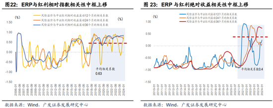 第三,22-23年,地产产业链处于持续调整过程,微观主体风险偏好下降。相对收益视角,本轮红利指数占优时段与地产债指数调整时段、万得全A股权风险溢价(ERP)抬升时段高度吻合。2020年以来,股权风险溢价水平与中证红利相对收益、绝对收益的相关性中枢均由负转正,前者提升至+0.63,后者提升至+0.4,提示本轮与过往发生了机制转换,风险偏好下降过程中,市场对红利资产“确定性”的交易成分有明显提升。