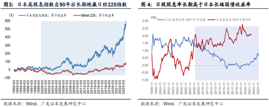 以日本的经验为例,日本高股息指数自90年代后持续长期跑赢日经225指数,与此同时,日本股息率也长期高于日本国债利率。