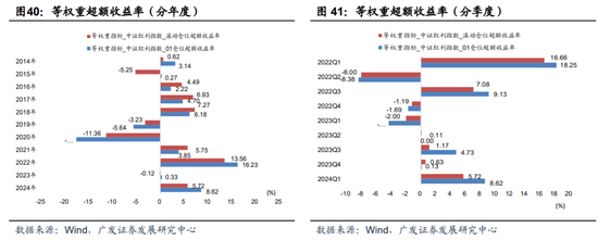 分年度来看,该方案较等权重在年度收益维度有所进步,在23年全年也能获得超额收益,其余有超额收益的年份仍主要是2016-2018、21、22、24年;分季度来看,22年至今,超额收益仍集中在22Q1、22Q3、23Q3、23Q4以及24Q1;分月度来看,超额收益与等权重方案一致,但滚动仓位的方式下,策略收益幅度略有提升。
