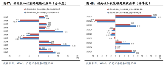 分年度来看,该方案较等权重、相关系数加权在年度收益维度均有进步,特别是在23年。季度和月度超额收益集中时段与等权重、相关系数加权基本一致。