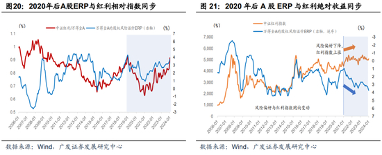 在上文中,我们提到,伴随着地产链条的调整,市场风险偏好较长时间维持在低位。同时,在中债利率的下行过程中,风险偏好(房地产债指数、股权风险溢价)与红利资产的负相关性明显强化。换言之,正是由于风险偏好的整体下移,对于稳定收益的需求增加,而恰好叠加了中债利率的下移,导致资产荒进一步放大,合力引致了对红利资产的追逐。