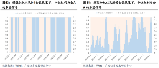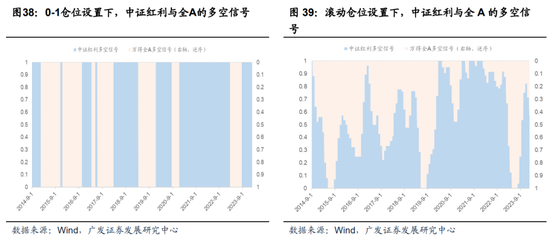 仓位设置也分两种视角,一则为“0-1仓位设置”:直接将正向择时信号处理为满仓(100%)持有中证红利指数,负向择时信号处理为持有万得全A;二则为“滚动仓位设置”:根据择时信号的强度,以每个时点过去36个月为窗口期,将择时信号的大小进行归一化处理,等比例映射到中证红利指数的持仓比重P。