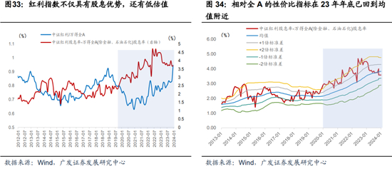 进一步地,我们以滚动36个月的±1倍、±2倍标准差作为评价这一性价比指标高低的标准。若超过+1.5倍标准差,则认为当前中证红利相对于万得全A极具性价比。而鉴于红利指数本身的高分红特点,我们认为只要性价比未触及至+1.5倍标准差,红利指数的赔率就尚未触及持仓做多的信号。比如在2023年1月,这一性价比指标处于+1.56倍标准差,提示红利指数的赔率高,应该持仓,而在23年2月后,这一指标已回落至+1.26倍标准差,并且23年年底已经回到均值附近。就该单一指标而言,红利指数的性价比在23年2月开始至今均不提示持仓做多信号。