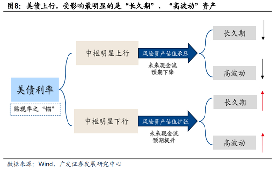 我们认为这背后与美债利率影响国内风险资产的路径相对确定和单一有关。美债利率主要通过贴现率从分母端对国内市场产生影响,而中债利率既有分母端流动性的传导机制,也有分子端盈利的反映。