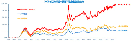 而如果拉长周期来看,从2005年至2023年的19年中,标普A股红利机会全收益指数的累计涨幅高达1975.17%,年化涨幅近18%。