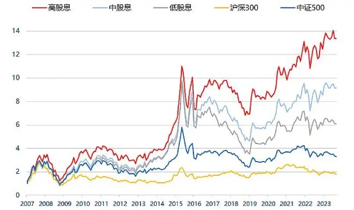 另外,如果将分红的上市公司按照股息率从高到低排序,分成数量相同的三组,组内股票按照等权构建组合,可以看出高股息股票长期表现显著跑赢,以高股息为核心筛选指标的红利策略在A股市场超额收益显著。