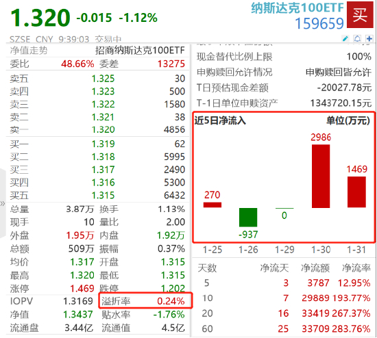 受此影响,纳斯达克100ETF(159659)早盘跌1.12%,盘中溢价0.24%。前一交易日,纳斯达克100ETF(159659)获资金净流入1496万元,为连续第二日资金净流入,近5个交易日合计资金净流入约3787万元。