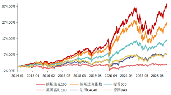 自2014年初以来至2024年1月26日,纳斯达克100指数累计涨幅385%,显著跑赢纳斯达克综合指数、标普500等美股主要指数,同时大幅跑赢英国富时100、德国DAX、法国CAC40等全球其他主要市场核心指数。