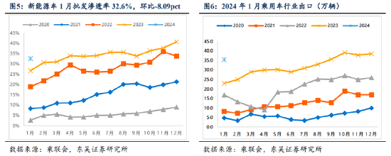 出口方面,今年总体汽车出口延续去年年末强势增长特征。1月乘用车出口(含整车与CKD)35.5万辆,同比增长51%,环比降7%。1月新能源车占出口总量的26.8%,较同期下降5.2个百分点。