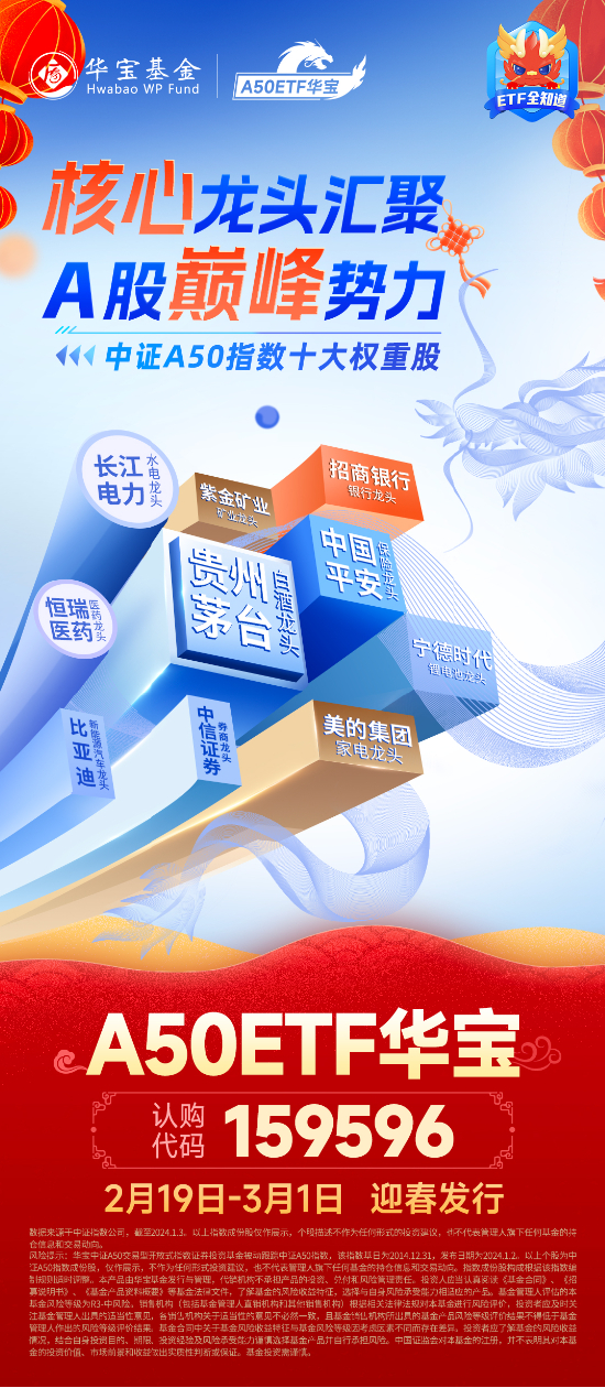 风险提示:基金管理人与公司实际控制人及股东之间实行业务隔离制度,公司实际控制人及股东并不直接参与基金财产的投资运作。A50ETF华宝(159596)标的指数为中证A50指数,该指数基日为2014.12.31,发布日期为2024.1.2,指数成份股构成根据该指数编制规则适时调整。文中指数成份股仅作展示,个股描述不作为任何形式的投资建议,也不代表管理人旗下任何基金的持仓信息和交易动向。基金管理人评估的本基金风险等级为R3-中风险,适合适当性评级C3以上投资者。任何在本文出现的信息(包括但不限于个股、评论、预测、图表、指标、理论、任何形式的表述等)均只作为参考,投资人须对任何自主决定的投资行为负责。另,本文中的任何观点、分析及预测不构成对阅读者任何形式的投资建议,亦不对因使用本文内容所引发的直接或间接损失负任何责任。基金投资有风险,基金的过往业绩并不代表其未来表现,基金管理人管理的其他基金的业绩并不构成基金业绩表现的保证,基金投资需谨慎