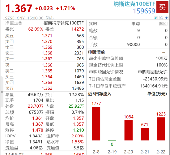 热门ETF方面,纳斯达克100ETF(159659)资金面持续火热。2月22日,纳斯达克100ETF(159659)获得资金净流入1225万元,为连续第3日资金净流入。近5个交易日合计净流入4757万元。
