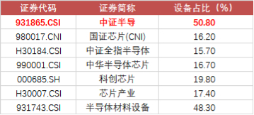 数据显示,中证半导指数主要聚焦半导体设备、材料、设计等上游产业链公司,其中半导体设备占比超50%,设备含量在主流半导体主题指数中是最高的。