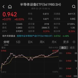 从指数表现上看,聚焦上游产业链的中证半导指数单日收涨7.99%,居主流半导体主题指数单日涨幅第一,场内唯一复制跟踪该指数走势的半导体设备ETF(561980)全天收涨8.03%,表现不俗。