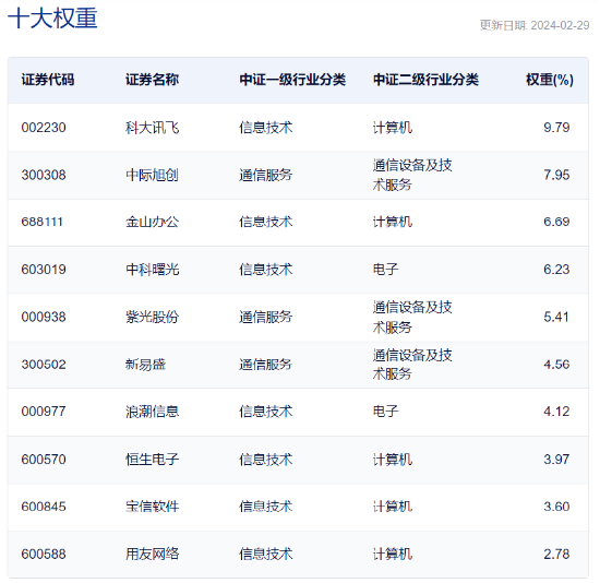 据了解,云计算ETF(159890)跟踪中证云计算与大数据主题指数,主要覆盖50只业务涉及提供云计算服务、大数据服务以及上述服务相关硬件设备的上市公司。前十大权重股占比合计55%,持仓集中度较高,囊括科大讯飞、中际旭创、金山办公、中科曙光、新易盛、紫光股份、浪潮信息等板块龙头。行业分布方面,主要覆盖计算机(57.82%)、通信设备及技术服务(26.82%)、电子(12.49%)等行业。